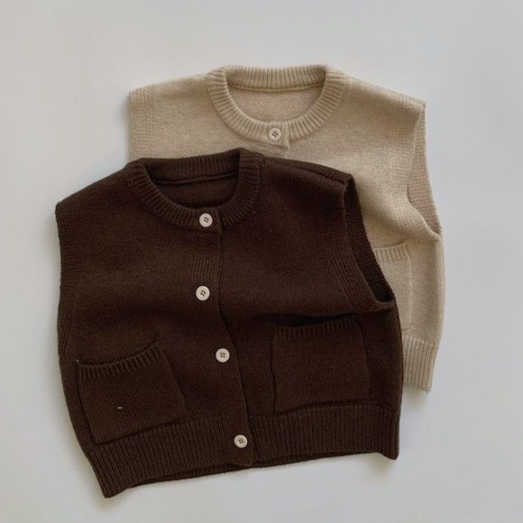 男の子のキッズファッションで人気の機能的な前ボタンとポケット付きニットベストです。