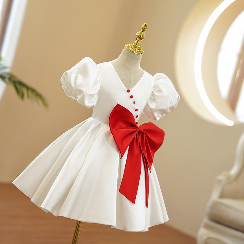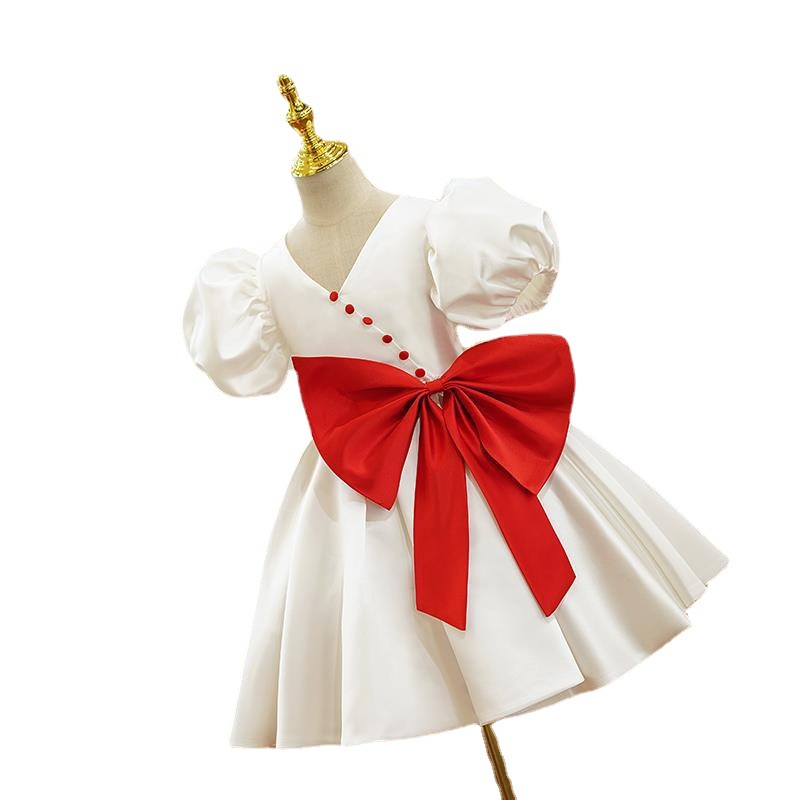 キッズファッションに映える、特別な日のためのドレスです。 ふんわりと膨らんだパフスリーブが愛らしく、上品なブイネックラインが首元を美しく見せます。 ウエスト部分に施された大きなリボンがアクセントとなり、華やかさを演出します。 ボタンのデザインが上品さをプラスし、ふんわり広がるスカートが可愛らしい印象を与えます。 発表会や結婚式、パーティーなどのフォーマルシーンにぴったりのドレスで、お子様を主役に輝かせます。