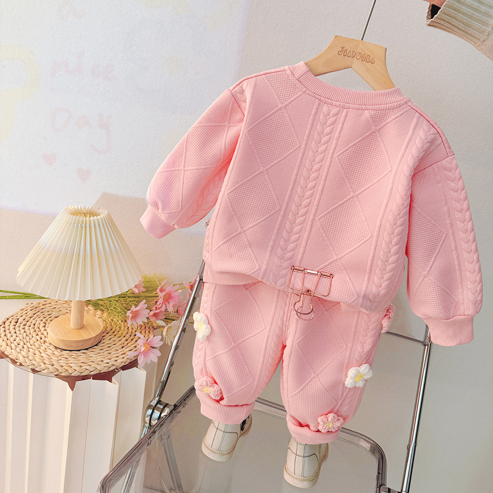 立体的なケーブル編みが魅力的なキッズファッションのニット上下セットです。 身頃には美しい模様編みを施し、袖と裾にはリブ編みで仕上げました。 胸元から裾にかけて配置された立体的な花モチーフが華やかさを演出します。 トップスとパンツの統一感あるデザインで、コーディネートに迷わず着られます。 柔らかな肌触りと伸縮性に優れた素材で、お子様の動きやすさと快適さを両立しました。 普段使いはもちろん、お出かけにもぴったりなニットセットです。