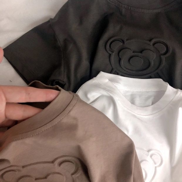 可愛らしいくまさんモチーフを立体的なエンボス加工で表現したキッズファッションにぴったりのTシャツです。