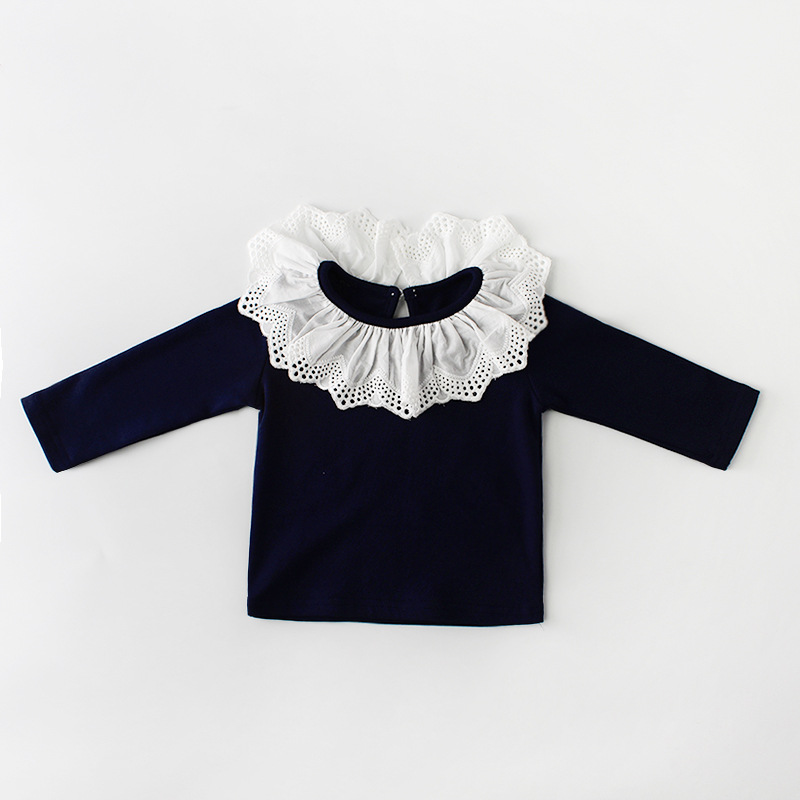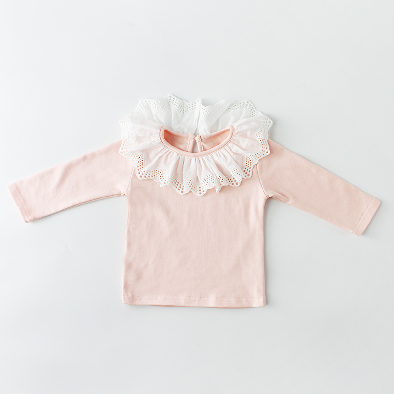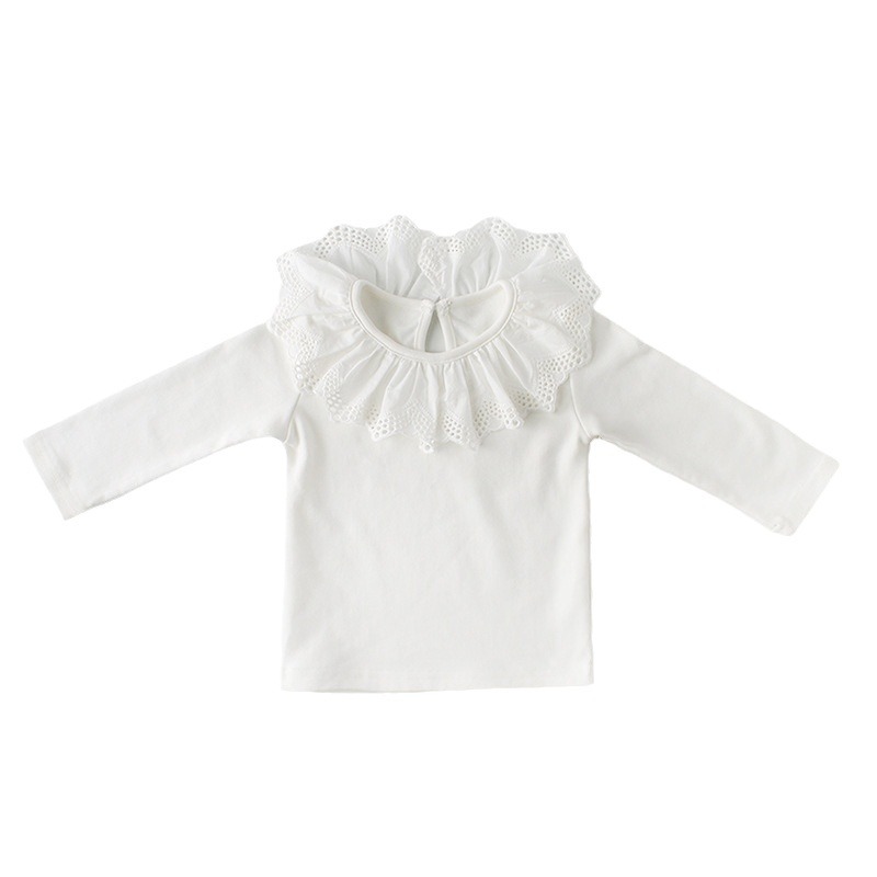 キッズファッションにぴったりな、華やかな襟レースが特徴の長袖シャツです。