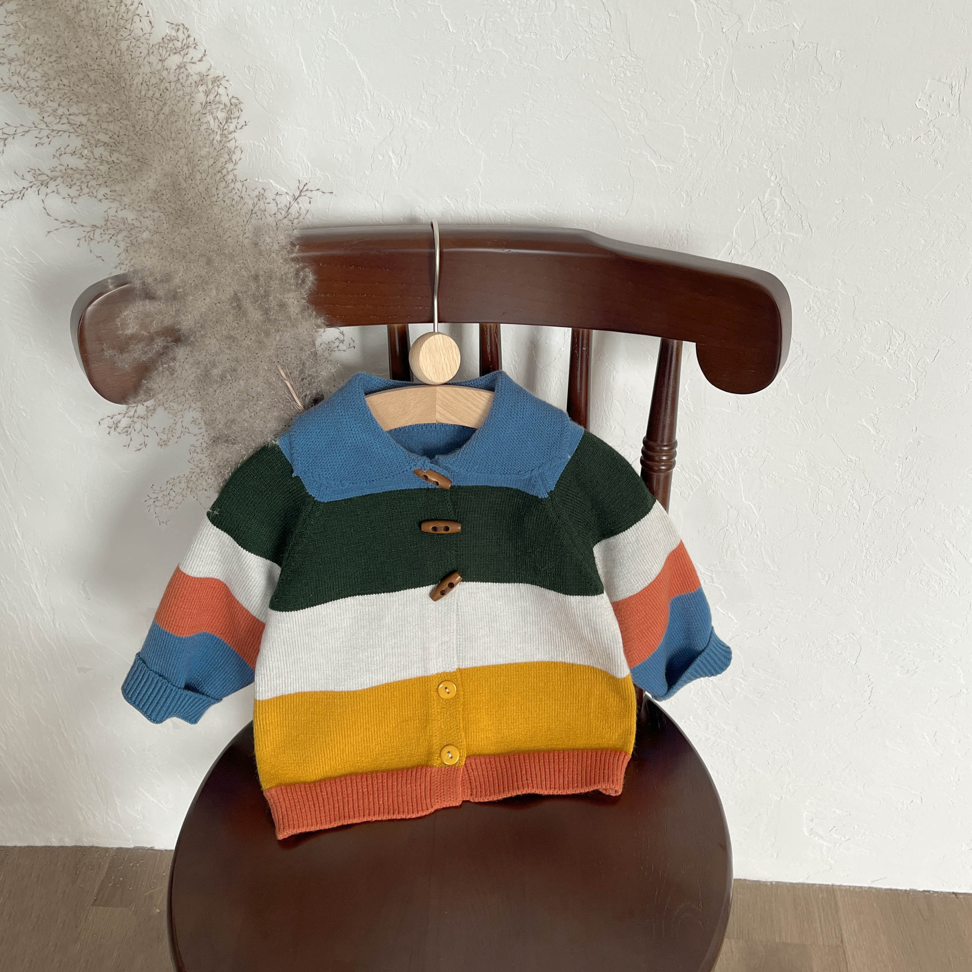「キッズファッション ニット 虹色ボーダー丸襟ニットカーディガン」は、明るい配色とやさしい着心地が魅力のキッズカーデです。丸い襟元と木製ボタンの組み合わせで、子どもらしい可愛さをぎゅっと詰め込みつつ、どんなコーデにも合わせやすい一枚に仕上げました。