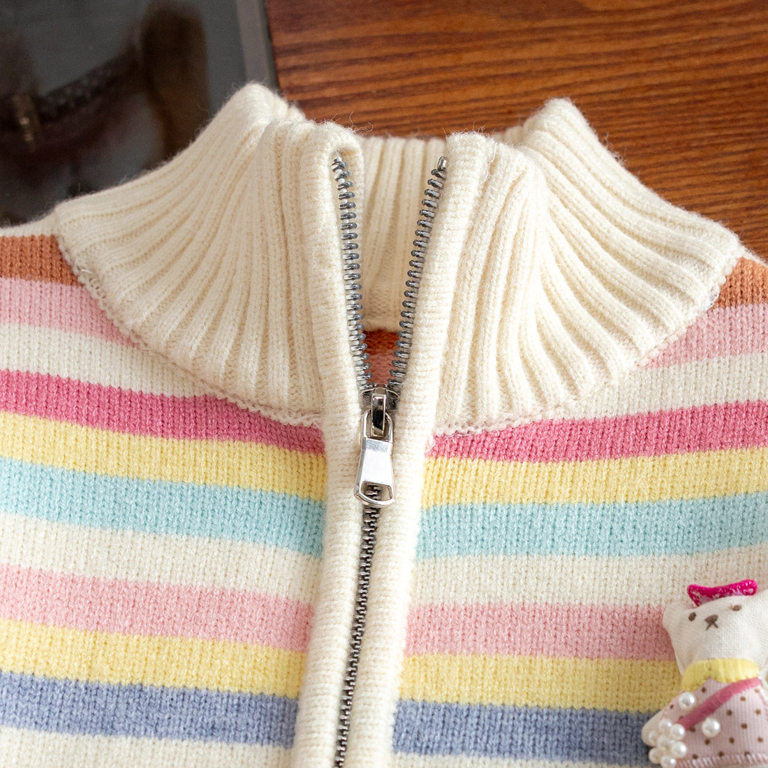 カラフルな虹色ストライプが目を引く、キッズ用ニットカーディガンです。ジップアップタイプで脱ぎ着がしやすく、忙しい朝やお出かけ前の「早くして〜!」という時間もスムーズに。胸元のさりげないワンポイント刺繍が、子どものかわいらしさを引き立ててくれます。