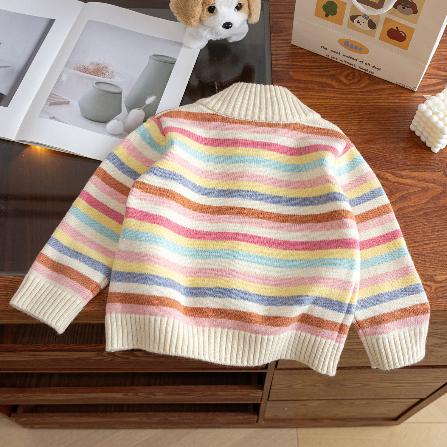通園・お出かけ・おうち時間…どんなシーンにもマッチする、毎日頼れる虹色ニット。お子さまの「かわいい」と「着心地のよさ」を両方叶えてくれる、ワードローブに加えたい1枚です。
