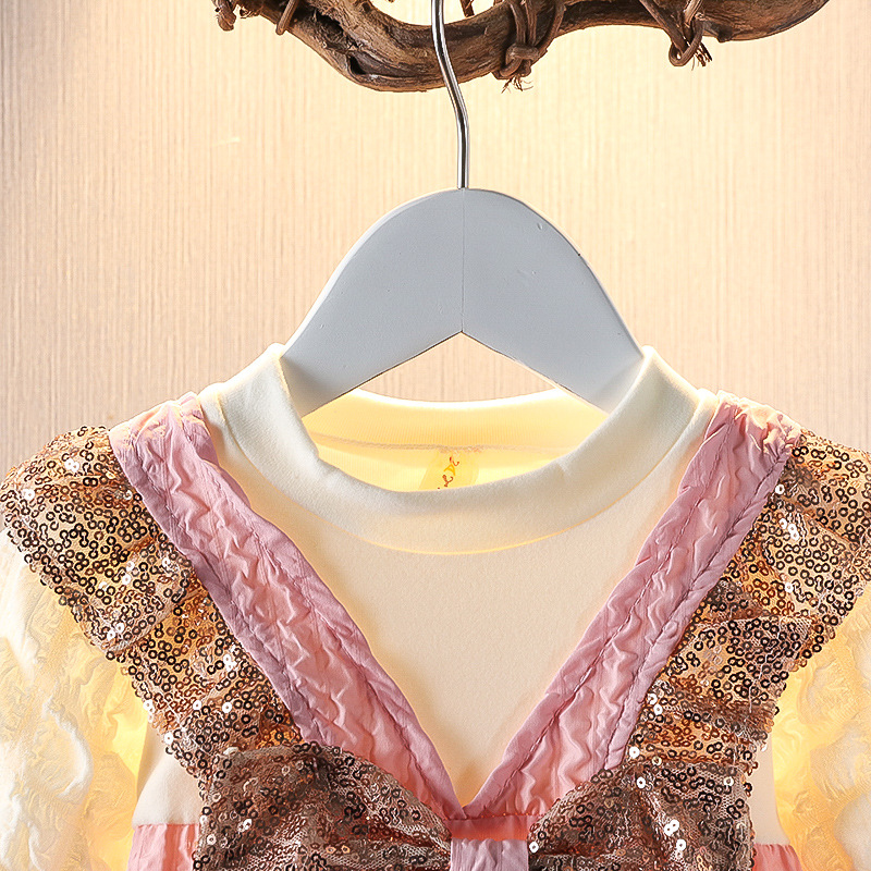 「キッズファッション きらきらリボン付き重ね着風長袖ワンピース」は、長袖トップスとジャンパースカートを重ね着したように見える、女の子らしさたっぷりの1枚です。胸元のきらきらリボンが主役になり、特別なお出かけの日にもぴったりの華やかさ。