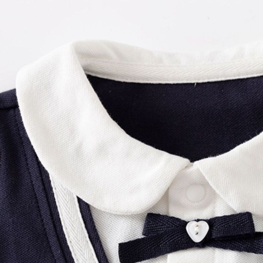 丸襟とリボン、胸元のエンブレムワッペンがきちんと感を演出しながらも、子どもらしい可愛さはしっかりキープ。ジャンパースカート風のデザインで、入学式・発表会などのフォーマルシーンから、家族のお出かけまで幅広く活躍するアイテムです。