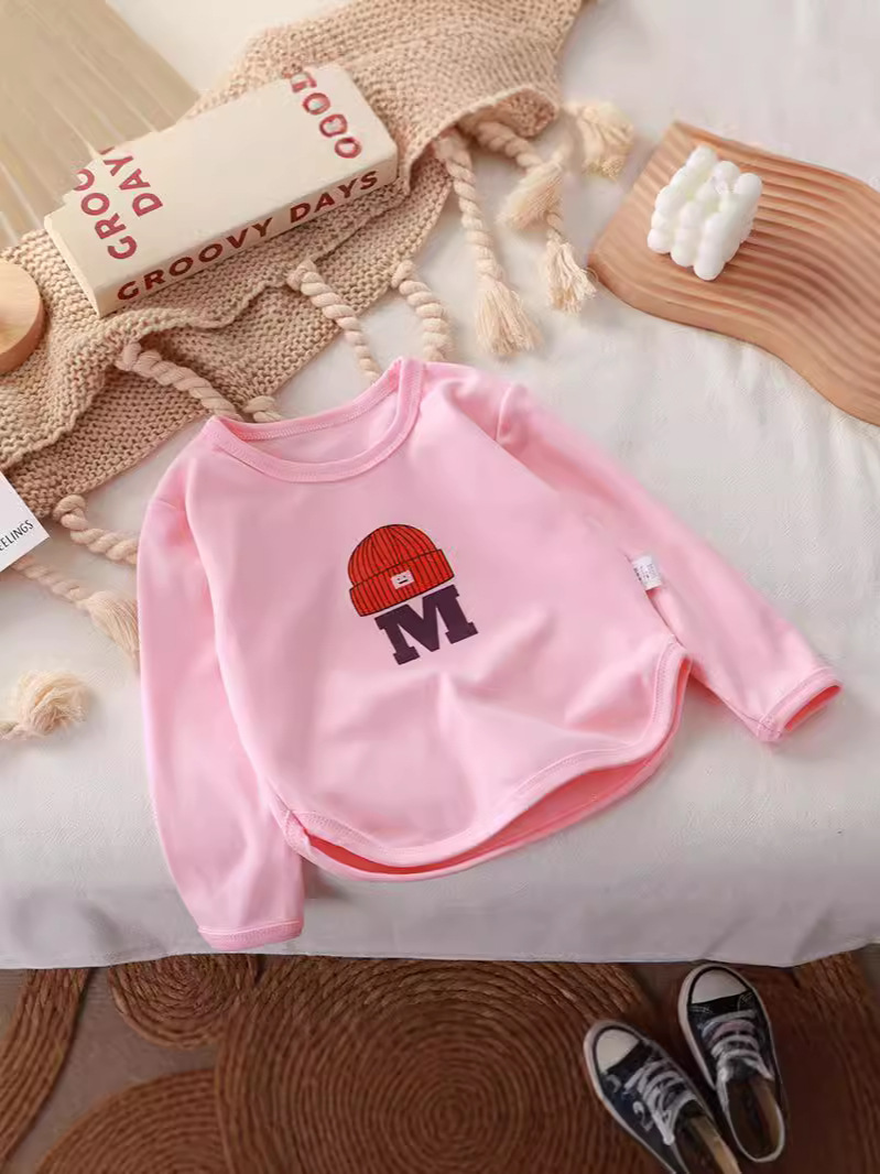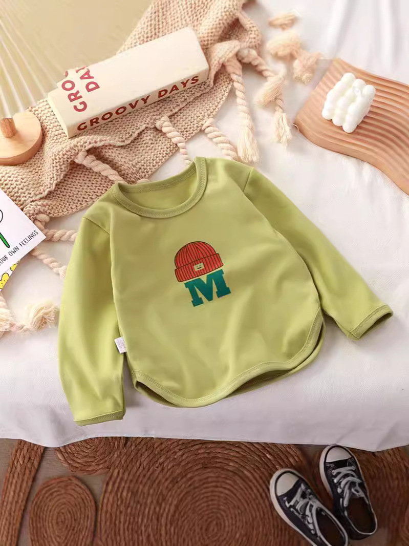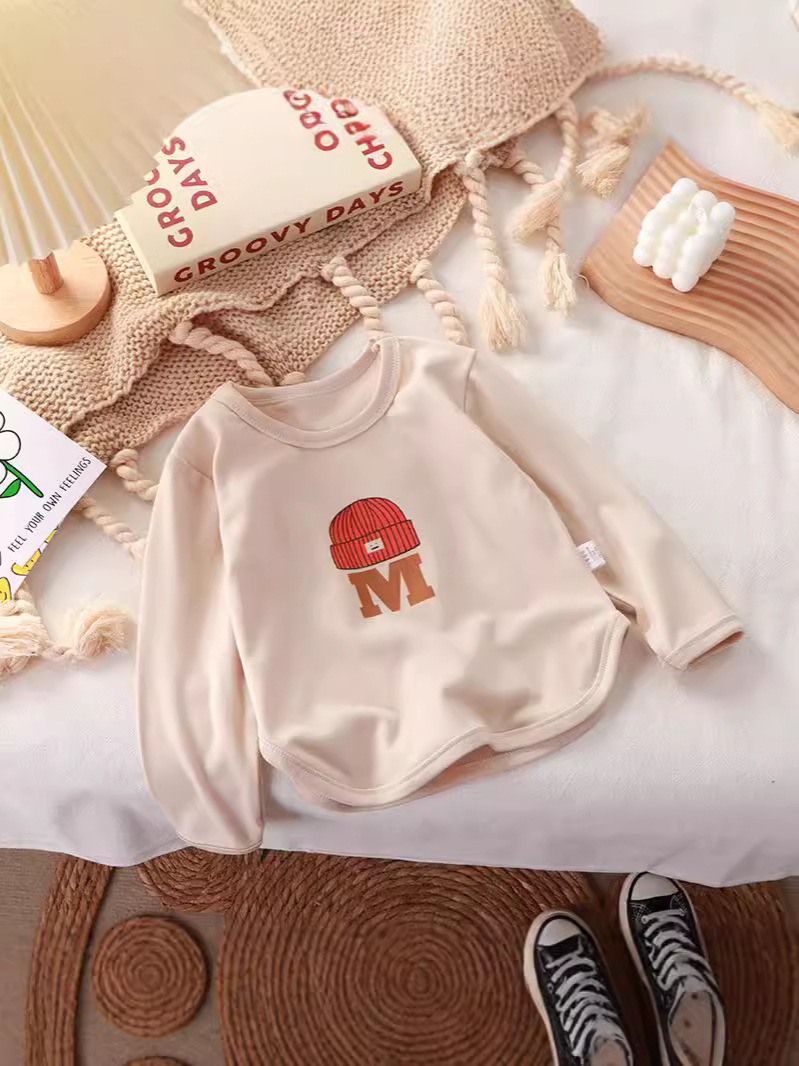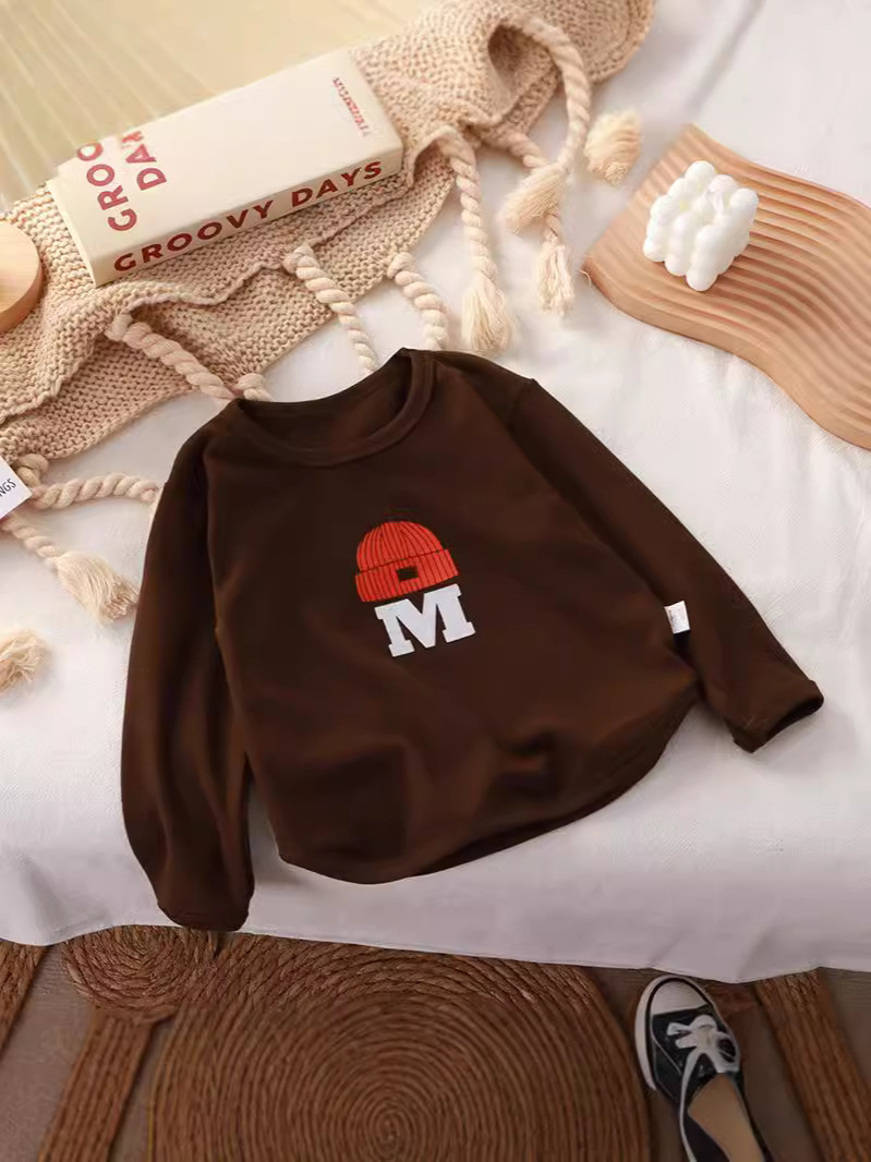 ニット帽をかぶったアルファベット刺繍がかわいい、遊び心たっぷりのキッズ長袖トレーナーです。ふんわり柔らかなニット風素材で肌あたりがやさしく、秋冬のデイリーコーデにぴったり。ゆったりシルエットで動きやすく、保育園・幼稚園からおでかけまで幅広く活躍します。ブラウン・グリーン・クリーム・ピンクの4色展開で、きょうだいリンクや色違い買いにもおすすめのプチプラトップスです。