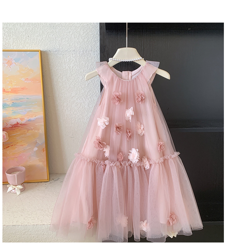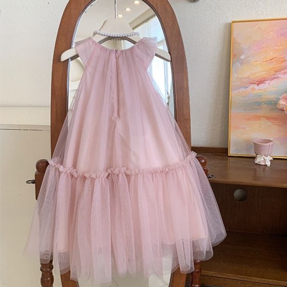 繊細なチュールと立体フラワーが華やかな、ピンクのプリンセスドレスです。ふんわり広がるティアードスカートと肩のリボンで、写真映えも抜群。発表会や結婚式、七五三のお呼ばれなど、特別な日に主役級のかわいさを叶えてくれます。90〜150cmまで幅広いサイズ展開で、姉妹おそろいコーデにもおすすめの一着です。