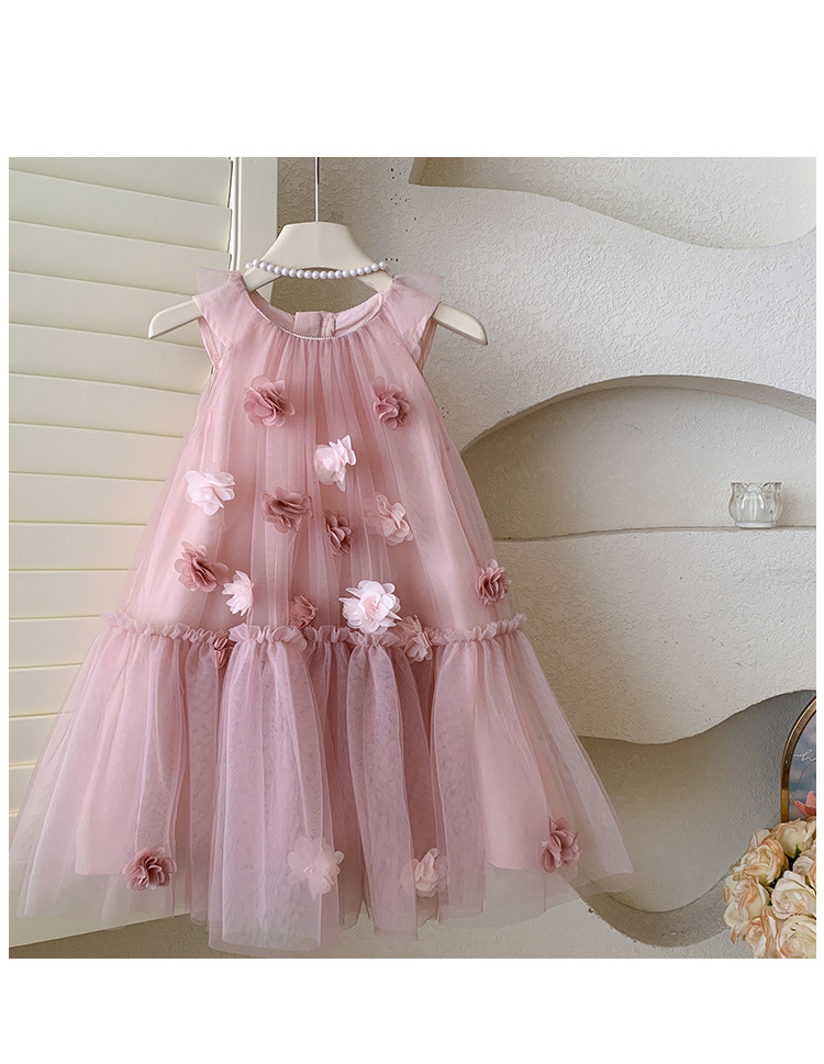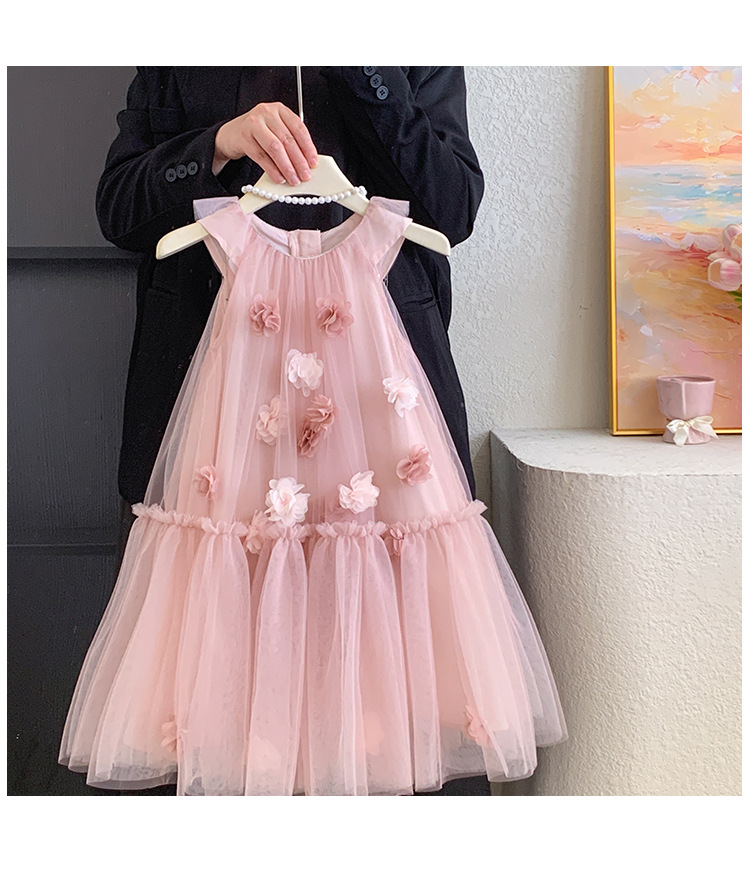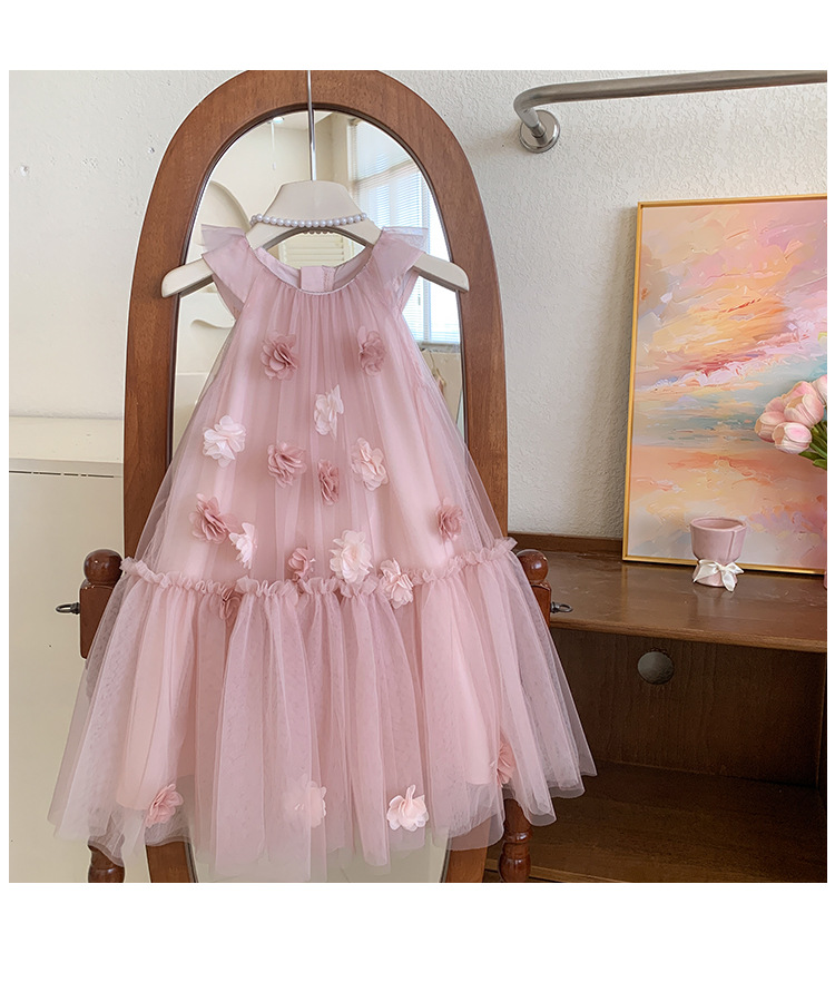 ふんわりチュールに立体的なお花をちりばめた、華やかなプリンセスドレスです。ひと目見ただけで「かわいい!」と声が出てしまう、特別な日のためのキッズドレス。
