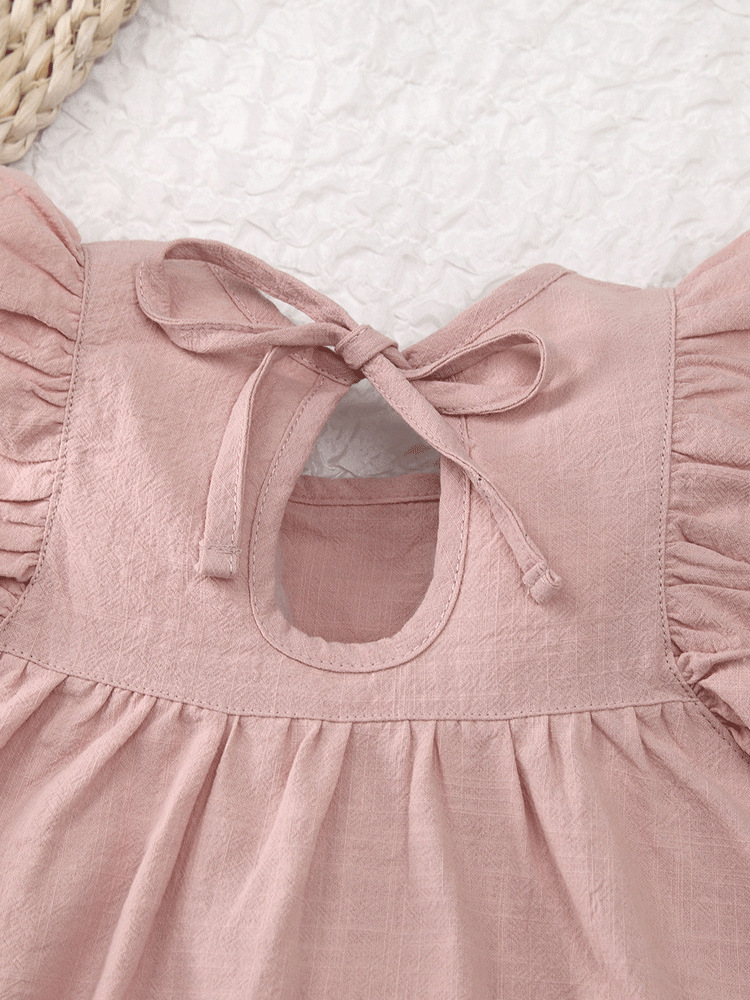 「キッズファッション ワンピース フリル袖リボン付き背中開きワンピース」は、女の子らしさたっぷりのデザインと、動きやすさ・着心地の良さを両立した一枚です。