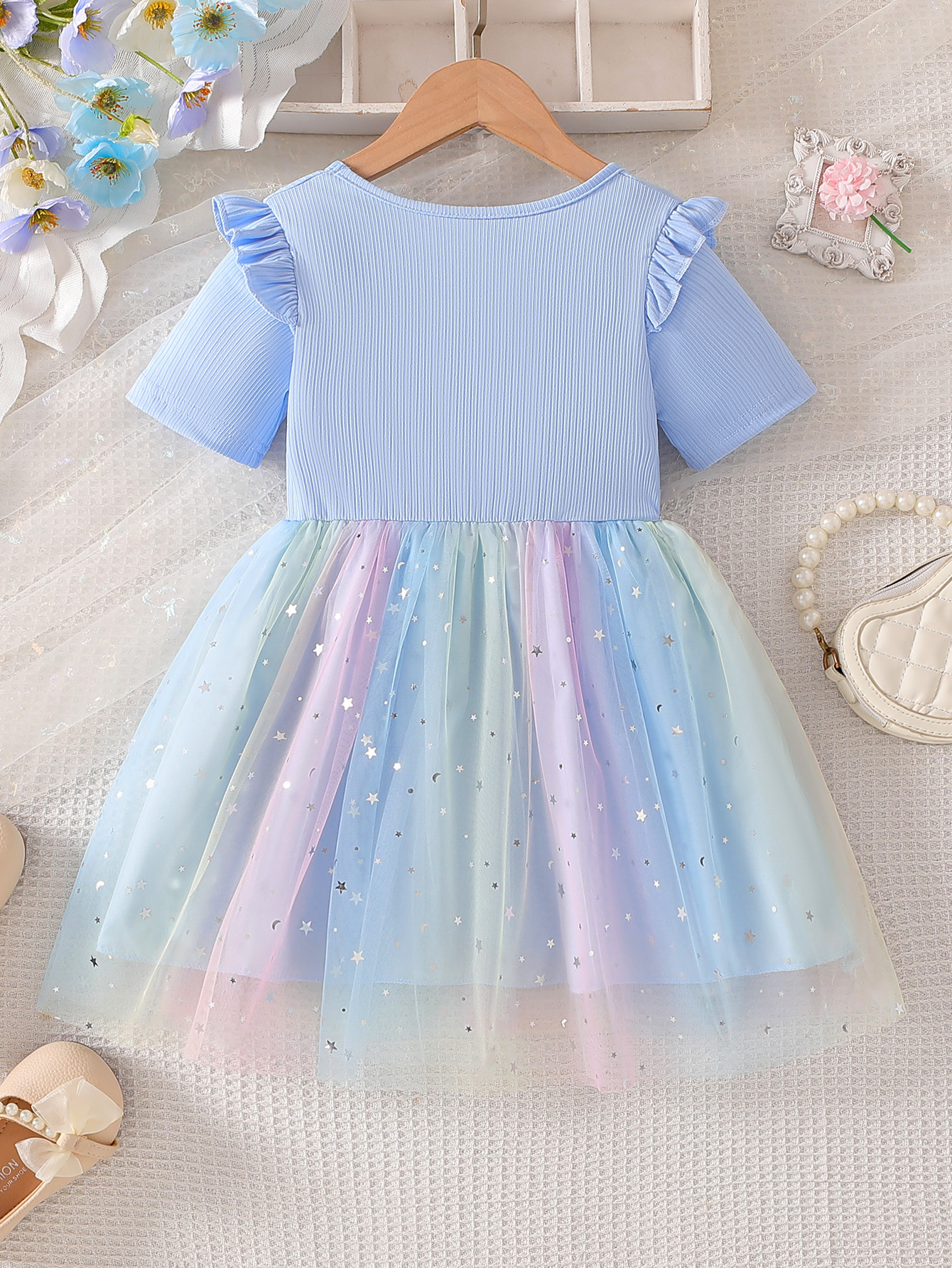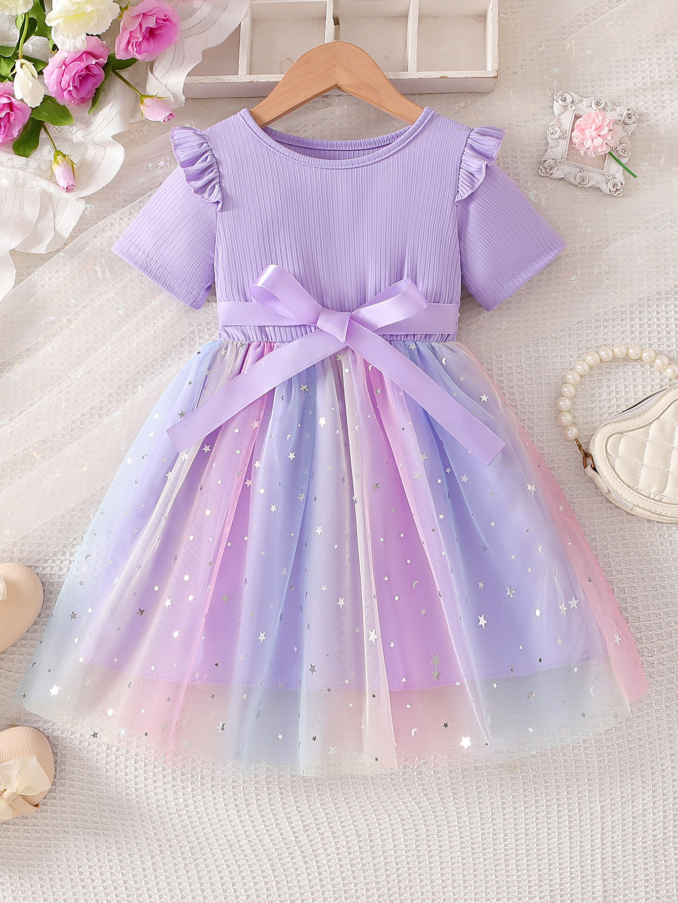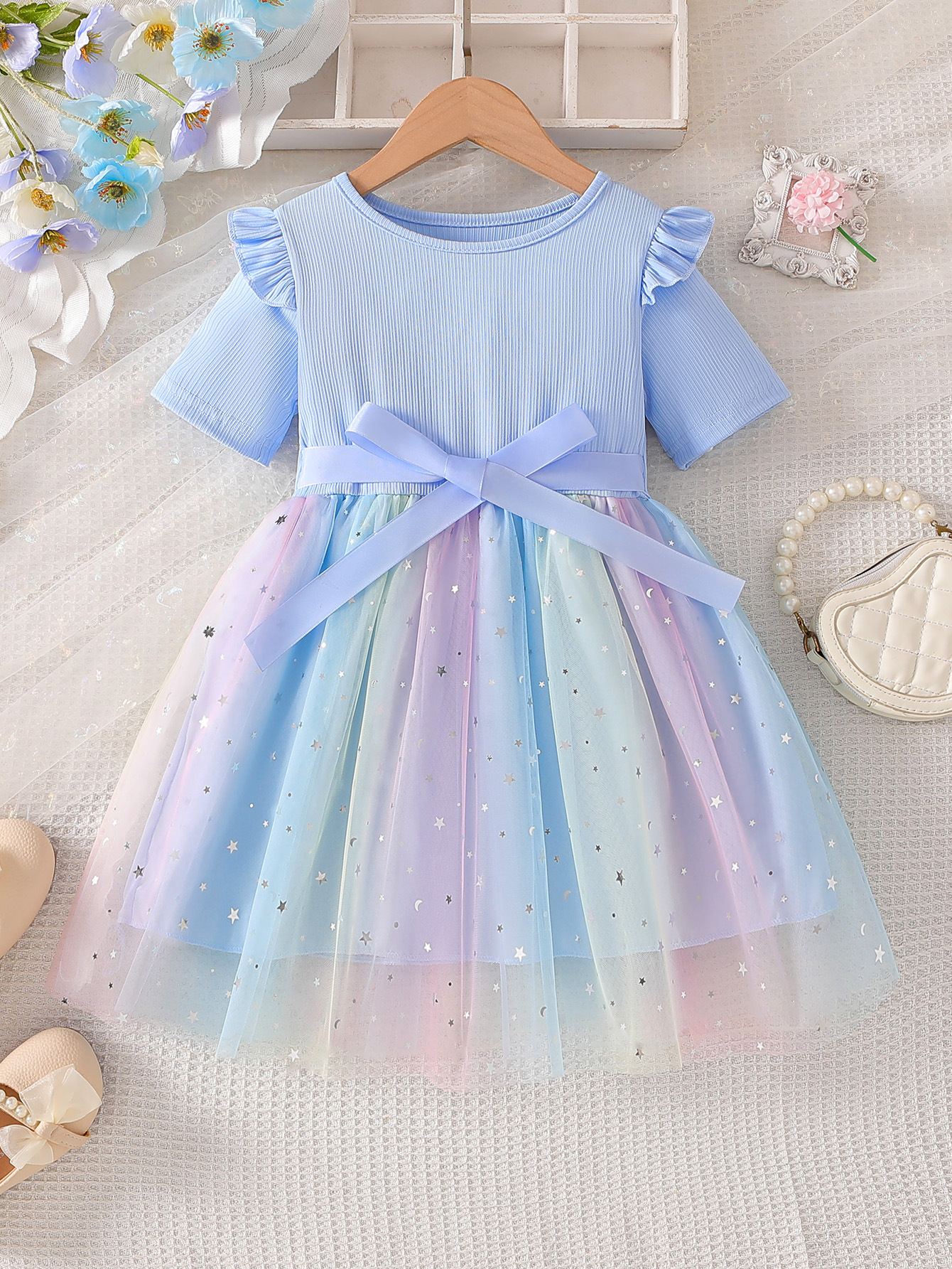 星空みたいにきらめく刺繍チュールと、大きなウエストリボンで「お姫様気分」を楽しめるドレス。