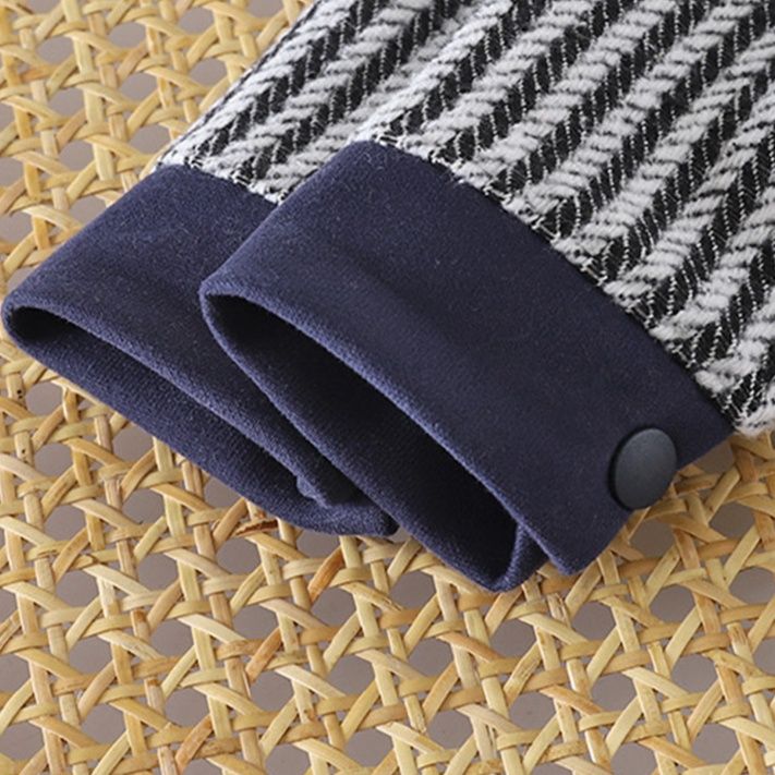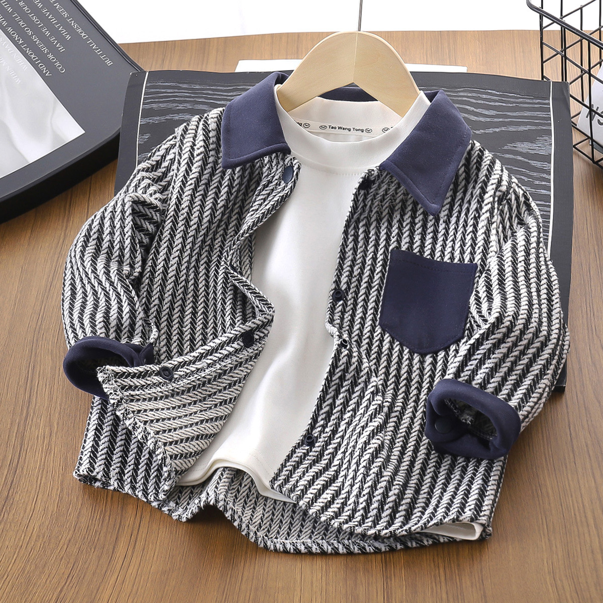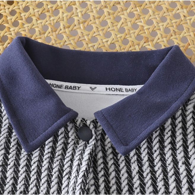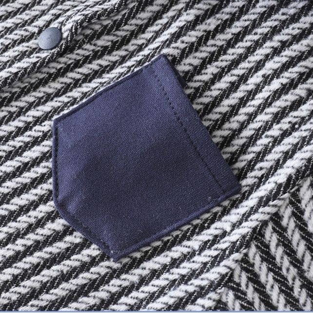 立体感のあるヘリンボーン柄が特徴的で、襟や袖口、胸ポケットに施された異素材の配色切替がアクセントになっています。
