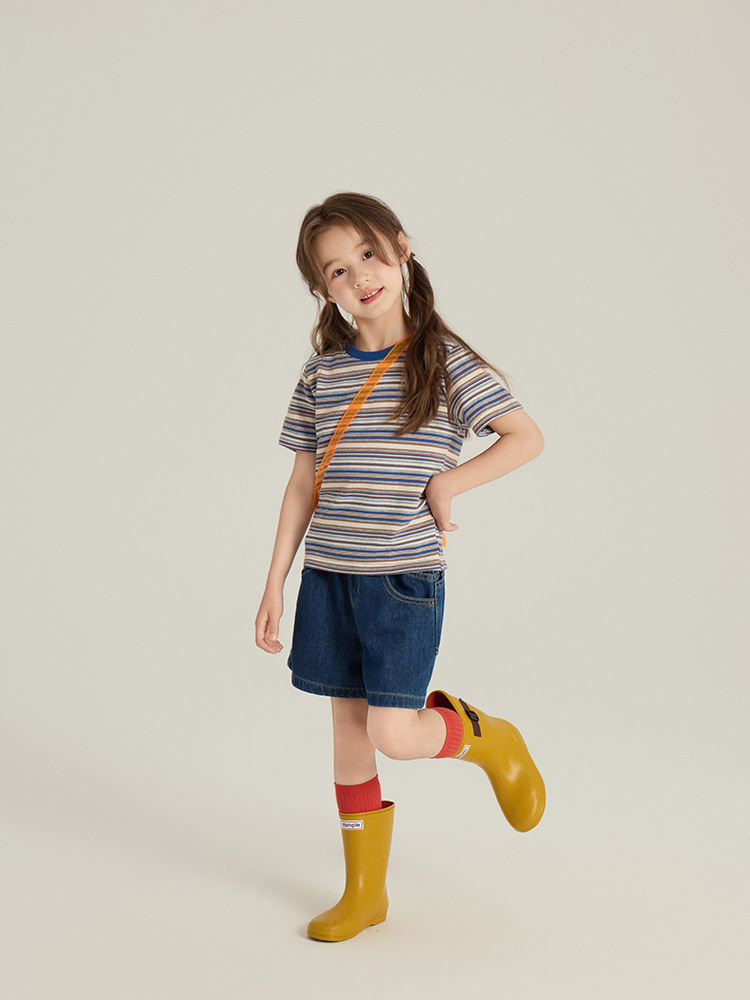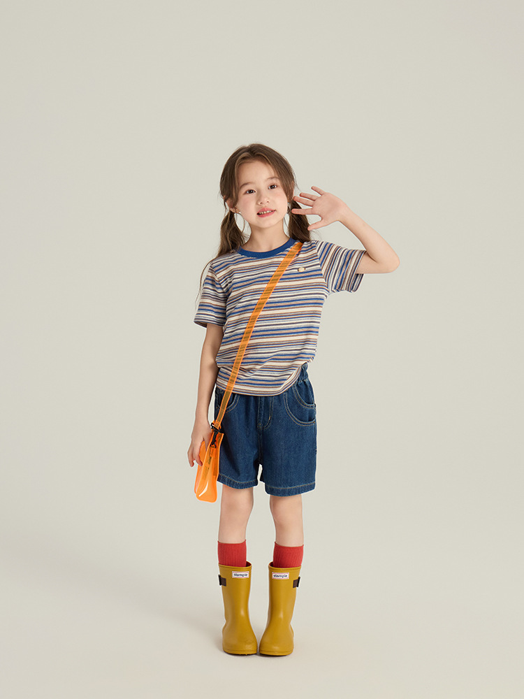 キッズファッションの定番ボーダー柄半袖とデニムパンツの可愛い2点セット。