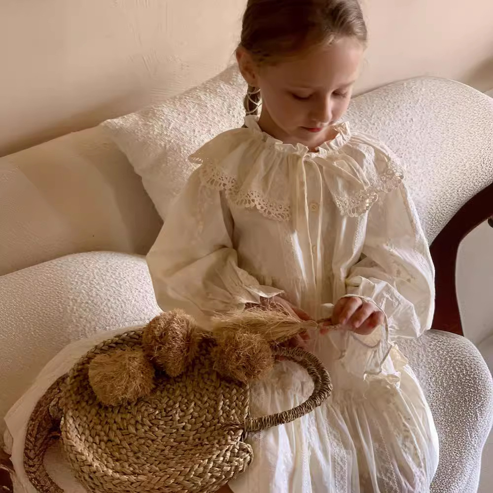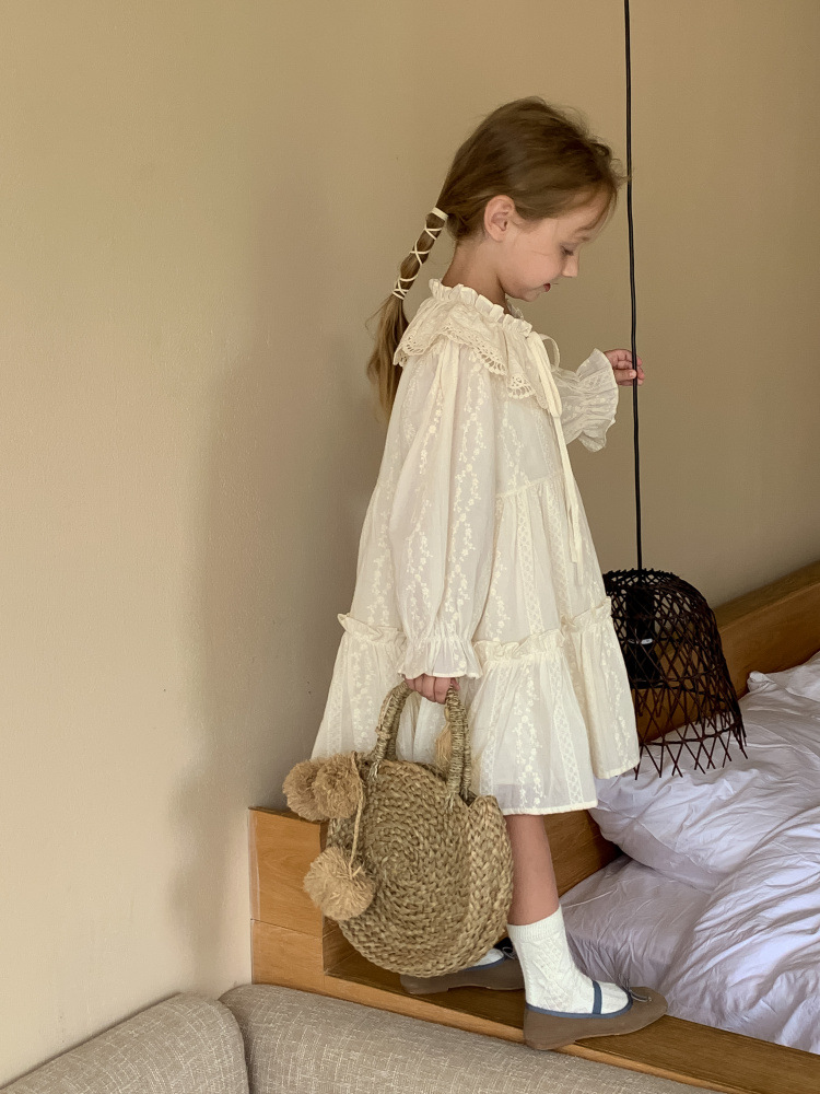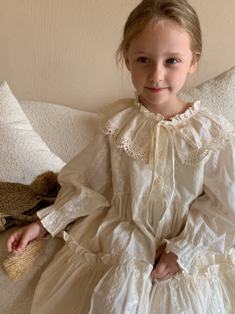 繊細なレースとフリル襟が目を引く、ホワイトの長袖ワンピース。胸元のリボンと袖口フリルが、子どもらしい愛らしさと上品さを両立します。裾に向かってふんわり広がるティアードデザインで、動くたびにひらひら揺れてとびきりガーリーな印象に。発表会や結婚式、記念日など「特別な日」はもちろん、タイツやカーディガンを合わせればお出かけコーデにも◎。90〜140cmまで揃ってきょうだいお揃いも楽しめる、少し背伸びしたおしゃれが叶う一着です。