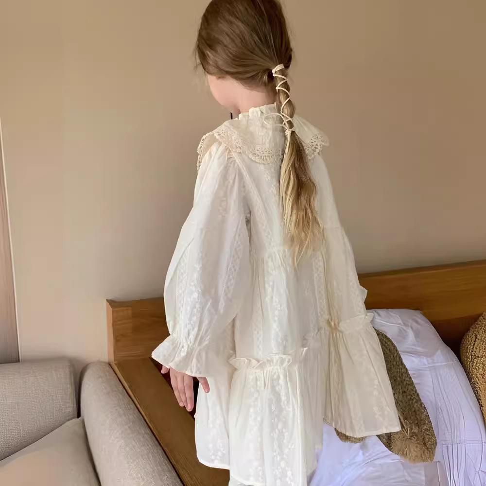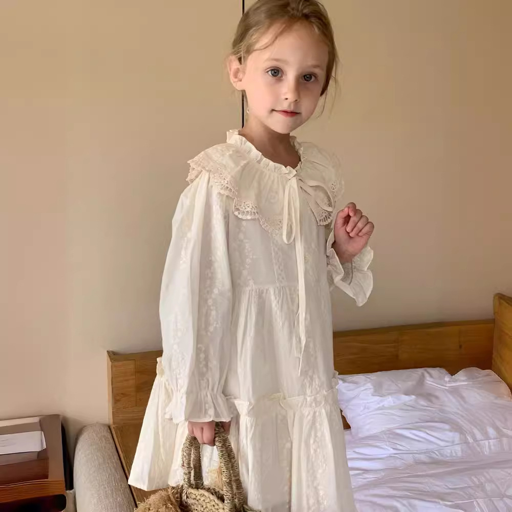 真っ白なレースとフリルが目を引く、女の子の「憧れ」をぎゅっと詰め込んだ長袖ワンピースです。胸元のリボンやティアードのふんわりシルエットなど、どこから見ても写真映えするディテールがたっぷり。発表会や結婚式、記念日の撮影など、少しおめかししたい日にぴったりの一枚です。